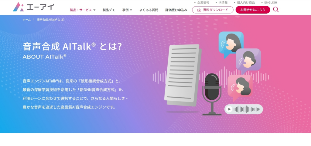 A.I.VOICE®シリーズは、音声合成エンジン「AITalk®」の技術をベースに、キャラクターの個性や感情表現を重視した音声生成ができるよう開発された音声合成ソフトです。
