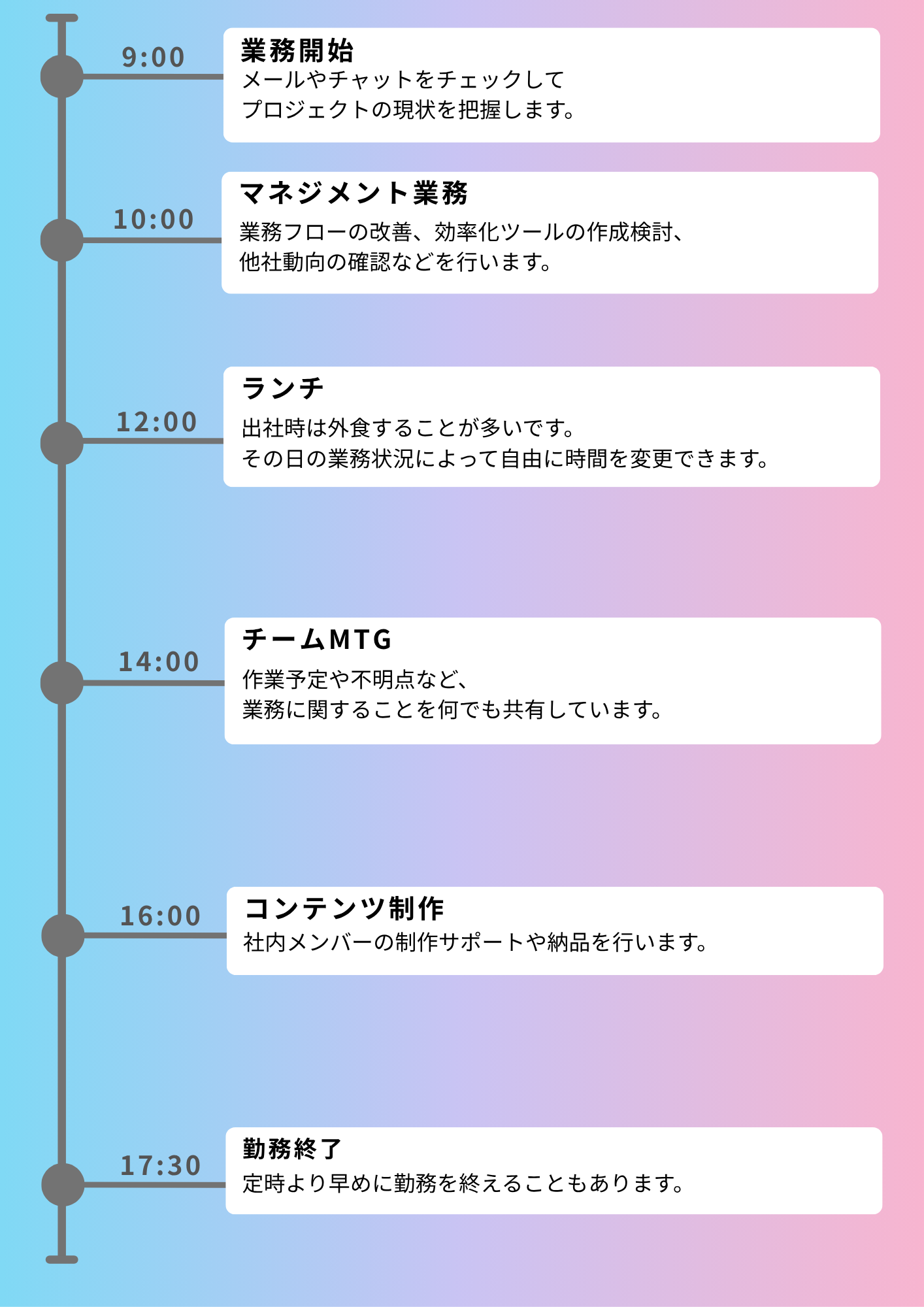 合成音声コンテンツの制作マネジメント業務を担当しています。例えば、お客様からいただいたデータをもとにしたコンテンツ制作、納品する際の制作物のチェック、制作フロー全体の改善などです。チームメンバーとなるべく話し合って、やりがいをもって作業に取り組めるような体制づくりを目指しています。