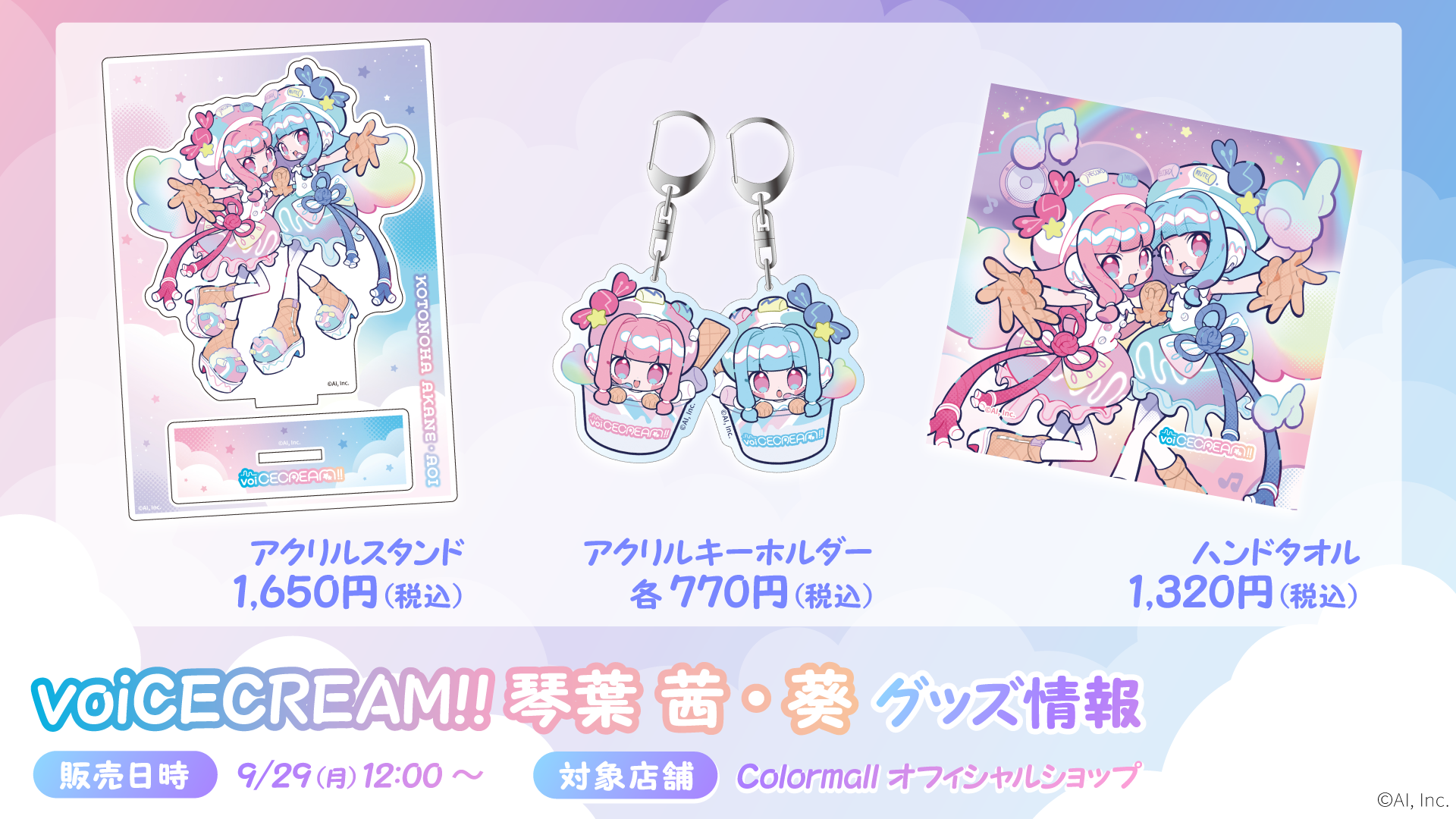 高品質AI音声合成エンジン「AITalkⓇ」を開発・提供する株式会社エーアイ(本社:東京都文京区、代表取締役社長:廣飯 伸一、証券コード:4388、以下「エーアイ」)は、個人顧客向けの新しい企画として、音声合成キャラクターグッズのECサイト「Colormall(カラーモール)」の運営開始をお知らせいたします。サイトは本日2025年9月29日12時よりオープンし、今後音声合成キャラクターの様々なグッズを販売してまいります。