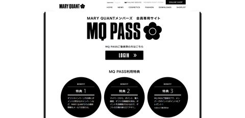 「MQ PASS」はマリークヮントの提供する入会費・年会費無料のサービスです。店舗をご利用いただいた方を対象にギフトキャンペーンやポイントキャンペーン等の会員限定のお得な情報を配信、会員専用のマイページでは購入履歴やギフト交換履歴、保有ポイント・有効期限をいつでも確認する事ができます。